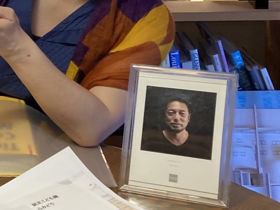 インタビュー中の2人を見守るかのような芳賀沼整氏の写真(インタビュー中の写真:福島県、以下も)