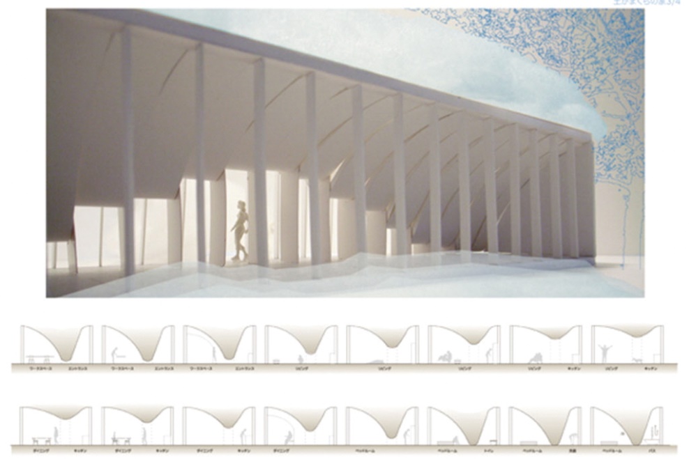 谷型にカーブしたコルゲートの屋根が、緩やかにつながり、洞窟のような室内空間をつくる。曲面天井により分節される室内は、大きなワンルーム。屋根のくぼみには、建設残土を入れ、雑草が覆い、締め固められる。土は大きな蓄熱体となり、北国の室内環境を穏やかに保つ。SDレビュー2010入選(資料:2点ともはりゅうウッドスタジオ)