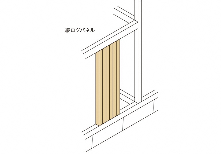 縦ログパネルのイメージ図。縦ログパネルは、在来構法の軸組みのなかで使うことができるのも利点(資料:はりゅうウッドスタジオ)
