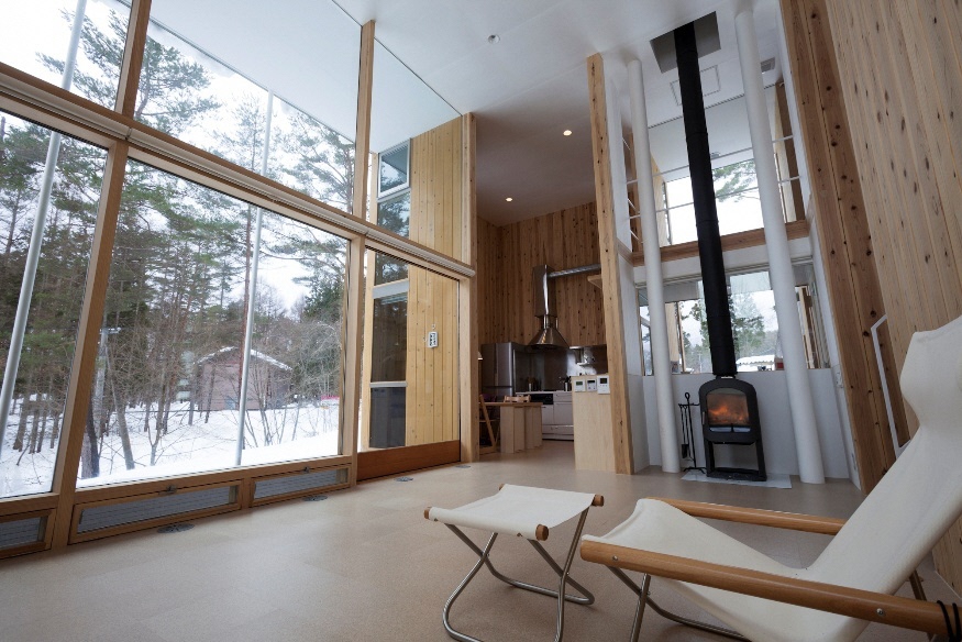 「はりゅうの箱」。2012年竣工。設計:はりゅうウッドスタジオ。監修:難波和彦+界工作舎。初めての縦ログ構法による住宅。150mm×6mのスギ柱をつなぎ合わせてパネルをつくった。雪深い地域に立地しているが、南側に大開口を設けて日光を取り入れ、暖炉の熱を基礎下に循環させるなど、温熱環境を工夫した(写真:3点とも藤塚光政)