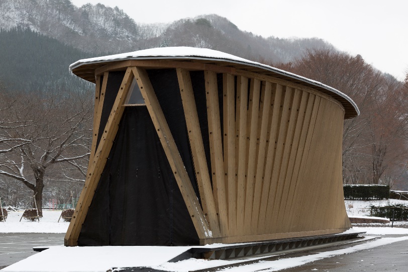 南会津地方の雪深い冬期間も利用可能なソフトボール用投球練習場。震災以降スポーツに関わる機会を制限された福島県内の子どもたちが集える場として計画された。地元の技術で生産できることを前提とし、南会津の工務店でパネル化した縦ログ構法を採用した(写真:はりゅうウッドスタジオ)