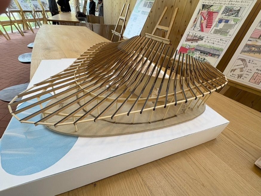 日本大学工学部の「ロハス工学センター棟」(ロハスの森「ホール」)の室内と模型。2024年竣工。設計:浦部智義・岩城一郎・中野和典・宮岡大/日本大学工学部ロハス工学センター(計画)、はりゅうウッドスタジオ+日本大学工学部浦部智義研究室、施工:蔭山工務店(写真:2点とも宮沢洋)