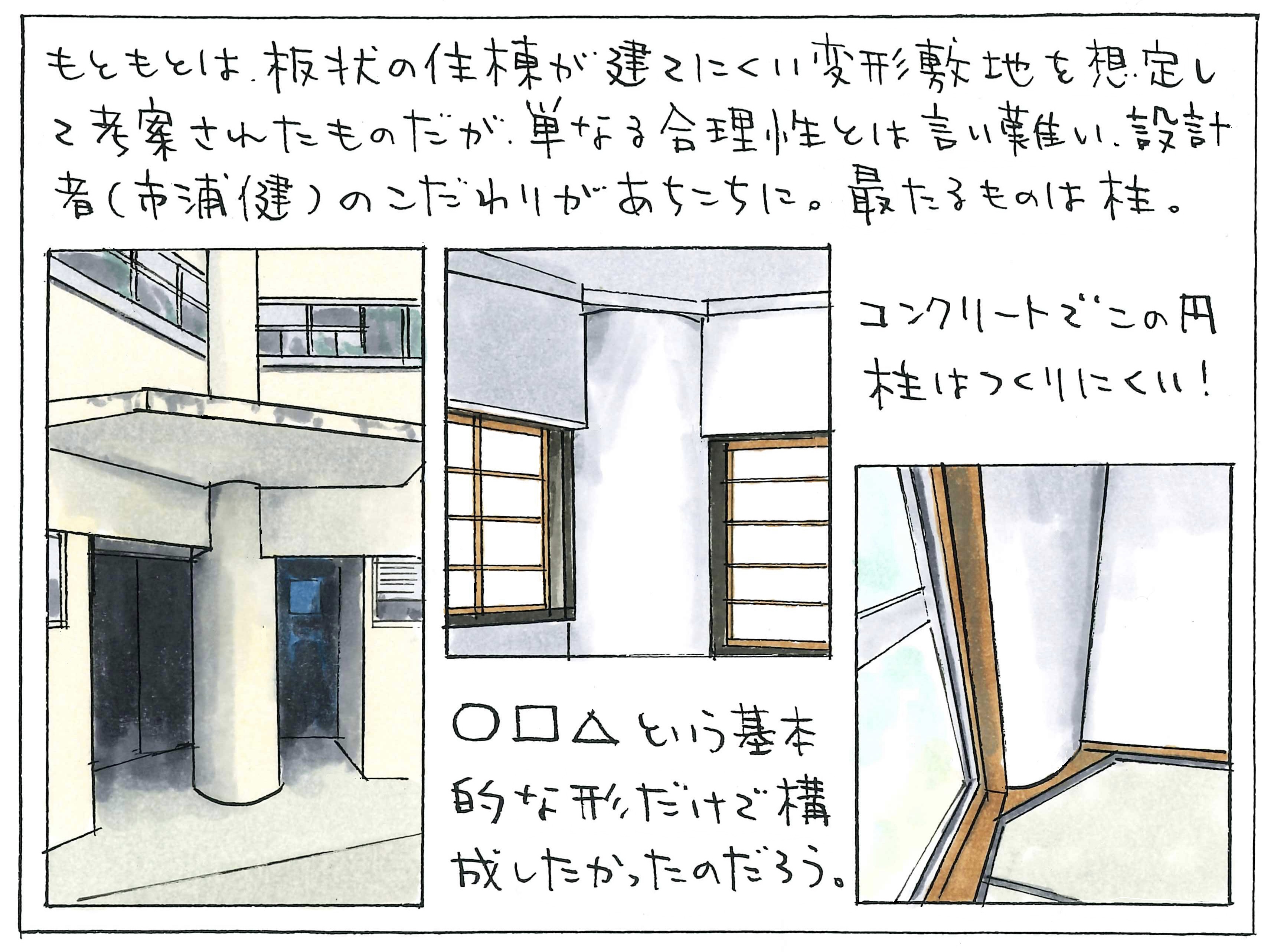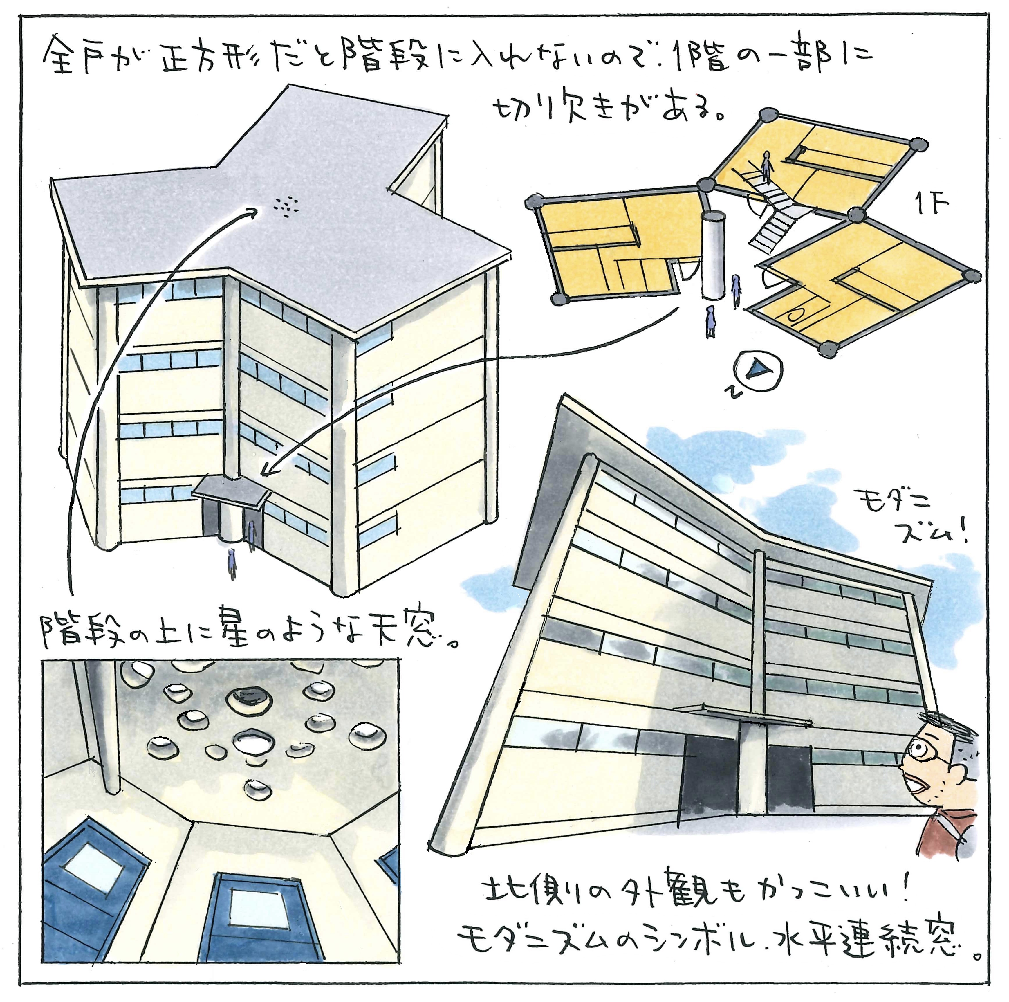 平面は「正三角形(階段室)」「正方形(住戸)」「正円(柱)」の3つの基本図形で構成され、階段室の採光のためのプリズムガラスブロックや水平連続窓などが特徴です。