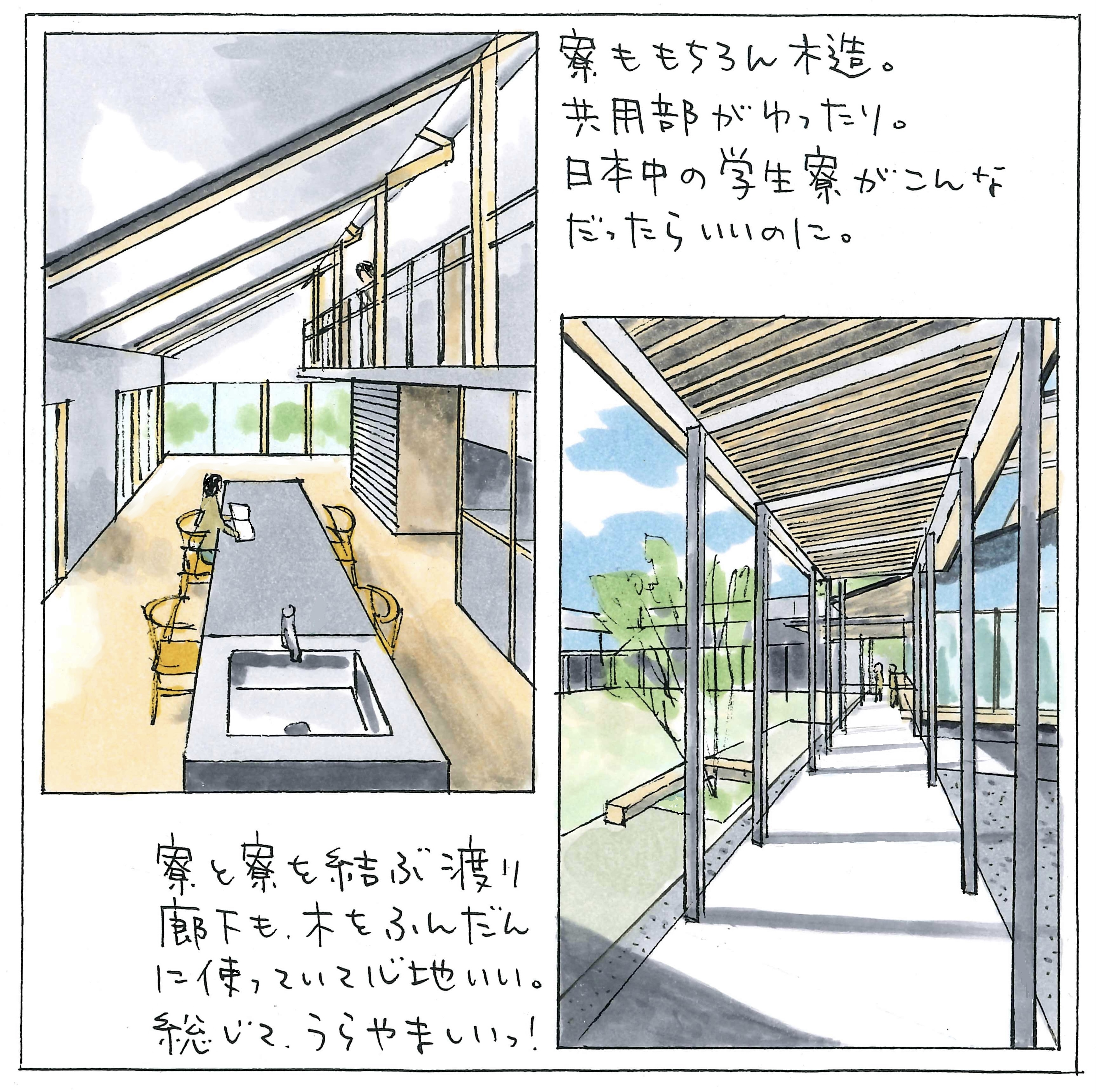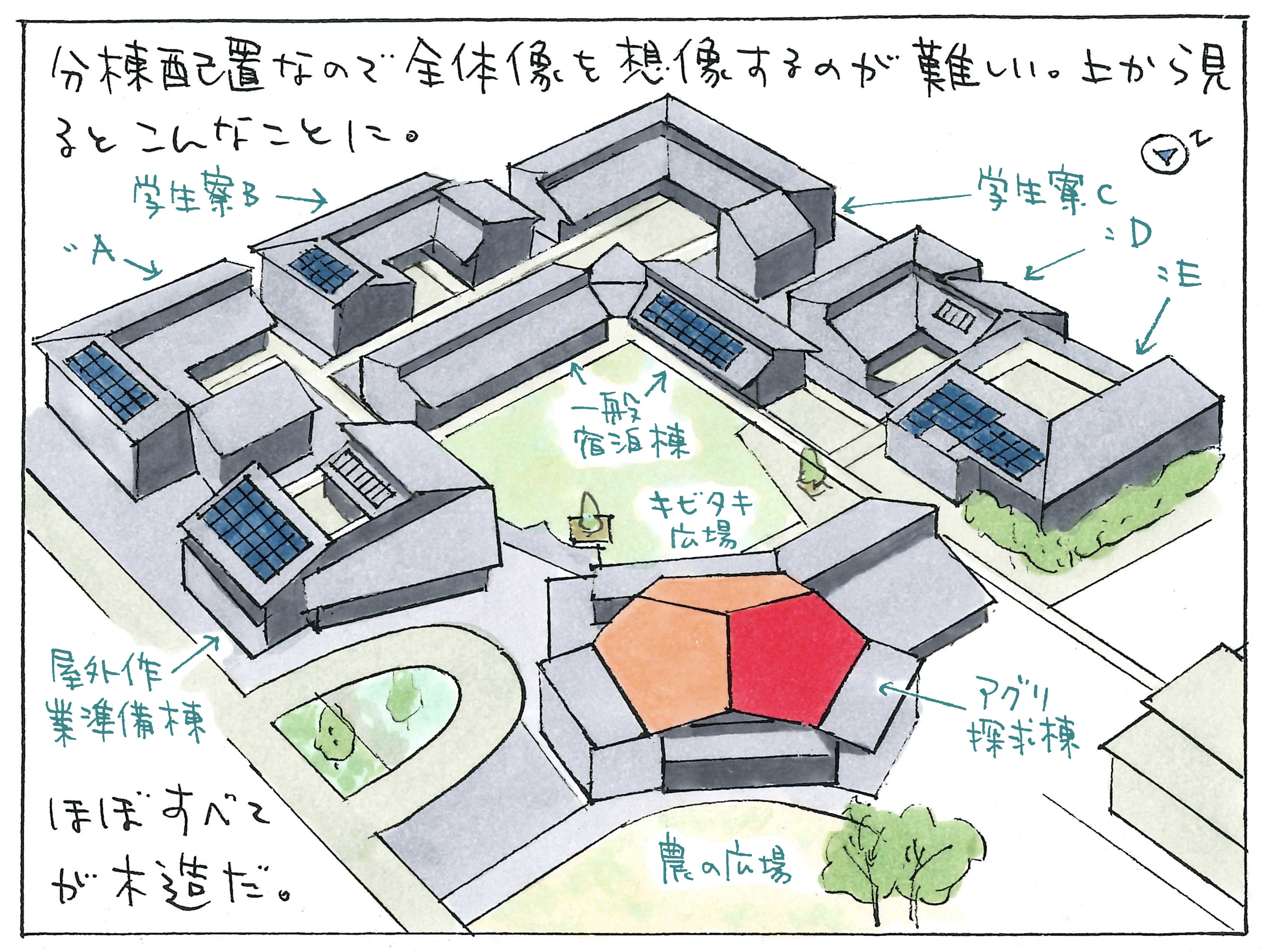 本施設は、学生や研修生、職員などが相互に学びあえる拠点となるよう、各棟が集落のように有機的に繋がりつつ、ゾーニングにより生活と学習の切り替えが可能となるよう配置しています。