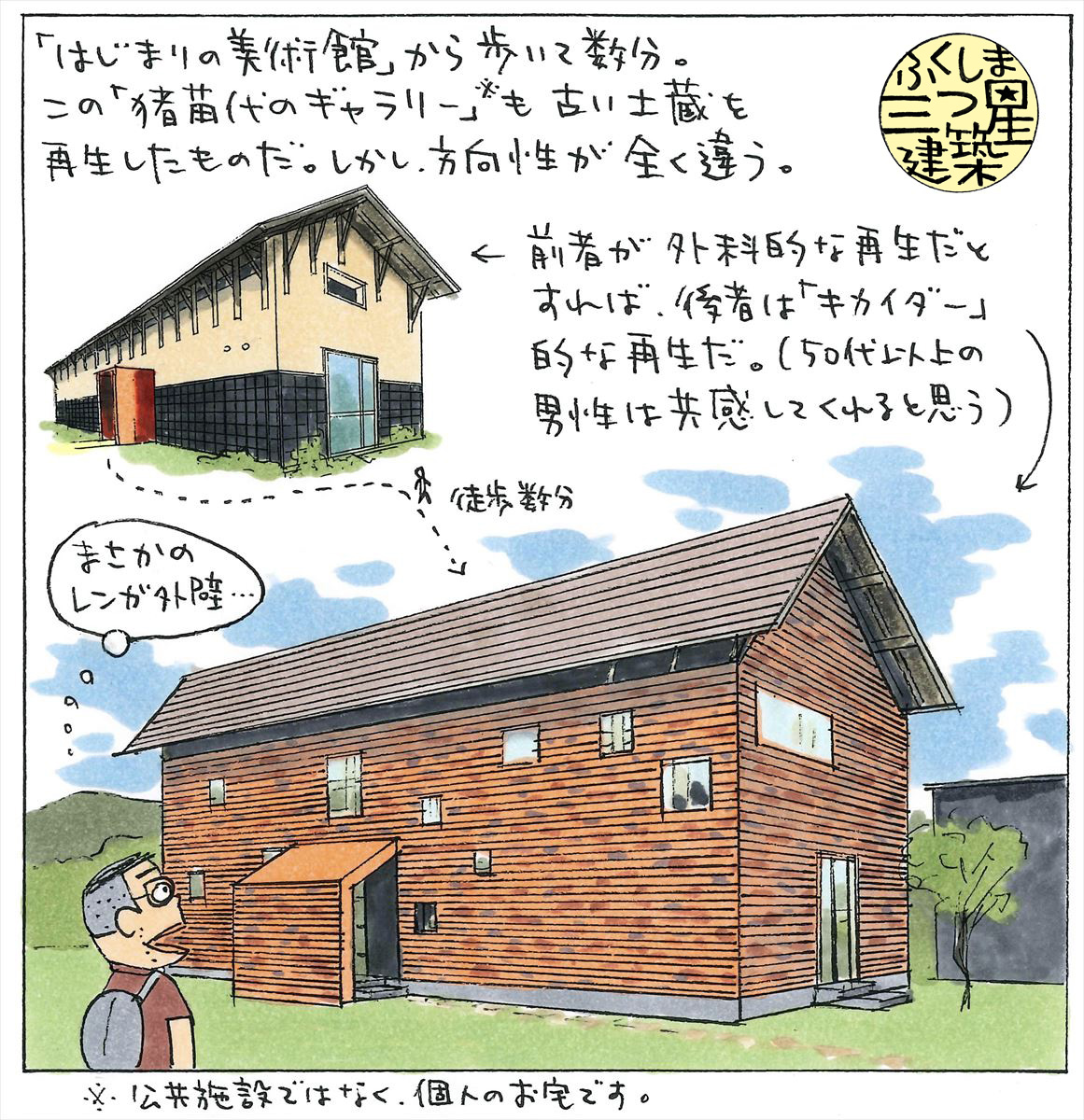 酒造作業蔵として1889年に竣工したこの蔵は、上棟時に磐梯山噴火で被災し、東日本大震災で再び被災した。磐梯山噴火当時、復興のシンボルとして竣工したこの蔵を、再び東日本大震災の復興の兆しとして保存再生させた。全壊した蔵を、伝統曳家によって新設基礎に据え直し、棟書きや家に語り継がれている当時から現在までの口伝の記憶(オーラルヒストリー)を意匠として丁寧に置き換えた。建物はギャラリー、会議、催し等で使用され、整備される町公園と繋がる予定である。